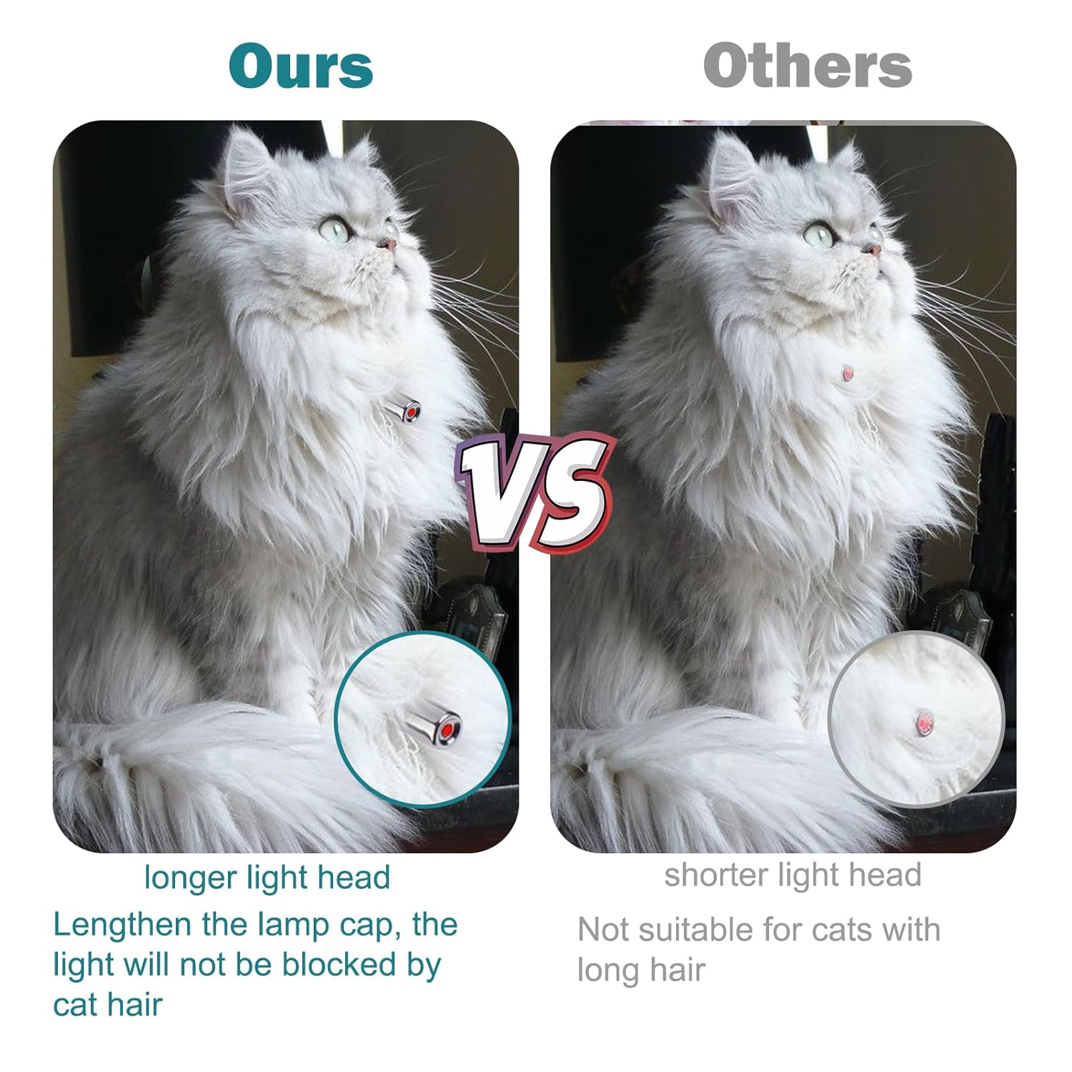 This automatic laser kitty toy has an elongated head, so even long hair won't block the light. And the light beam is soft and harmless to their eyes. Great cat toy.
