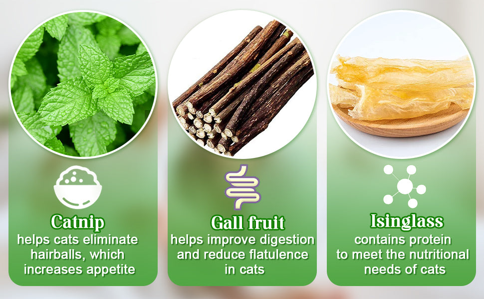 - The catnip balls are made of pure natural plant extracts, totally safe and edible for cats without no chemical additives contained. Catnip and gall fruit could effectively reduce cat’s dental plaque and tartar, freshen breath and improve oral health for your kittens.