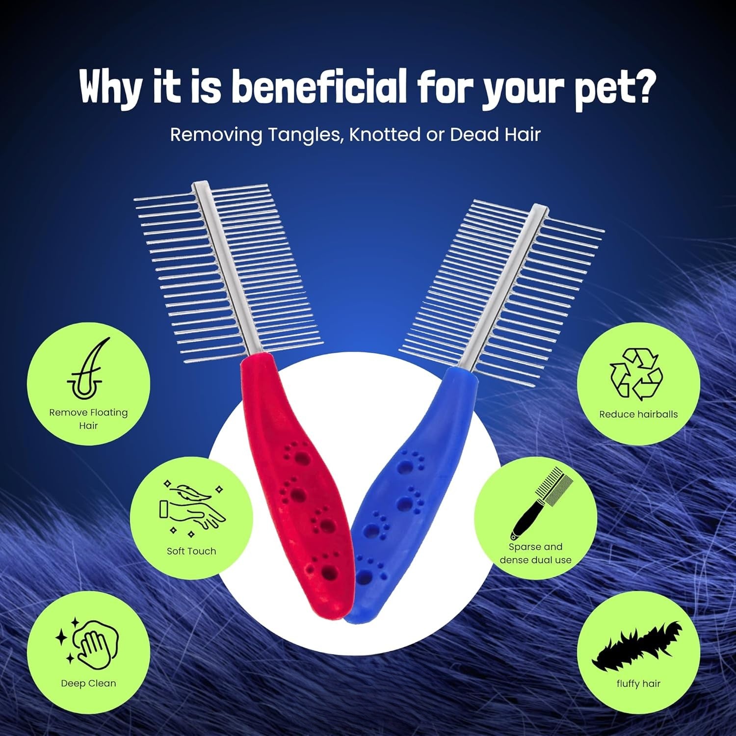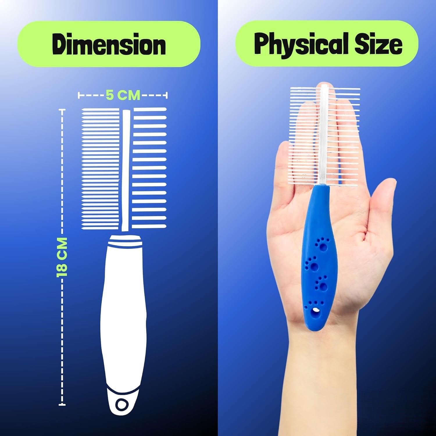 The dandruff comb's ergonomic rubber handle and the dog tick comb's stainless steel metal teeth are comfortable to feel and easy to grip this increases the comfortableness of holding the comb when combing your pet.