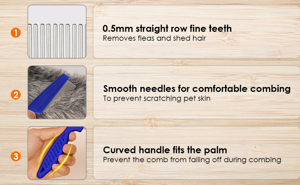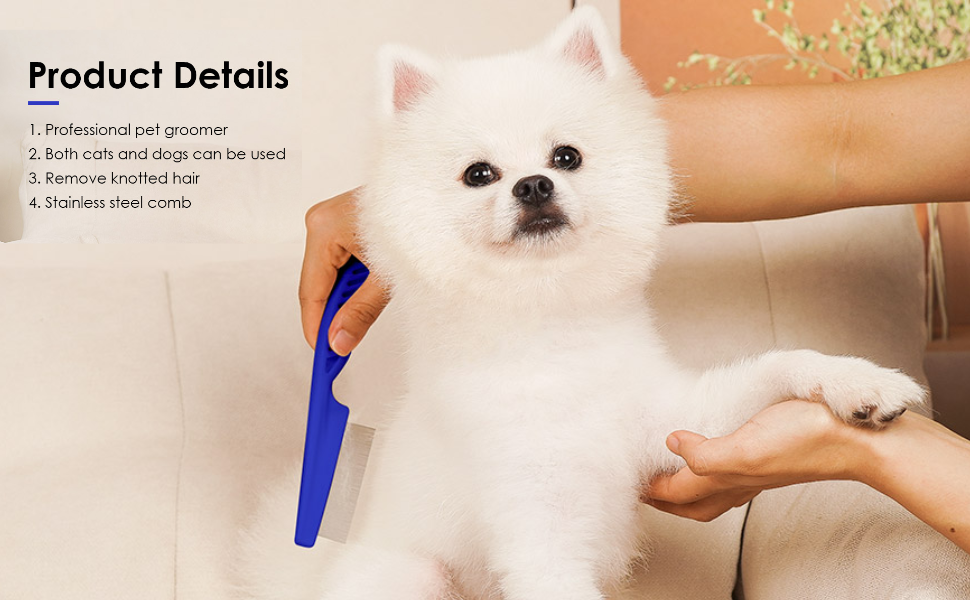 - The pet fine tooth comb is made of high-quality plastic & stainless steel. The balanced tooth groove and rounded tooth ends protect from pricking, scratching, or pulling and protect the scalp and hair. A pet's hair comb can not only comb down the dead hair of pets but also promote the blood circulation of the epidermis, making the hair grow.