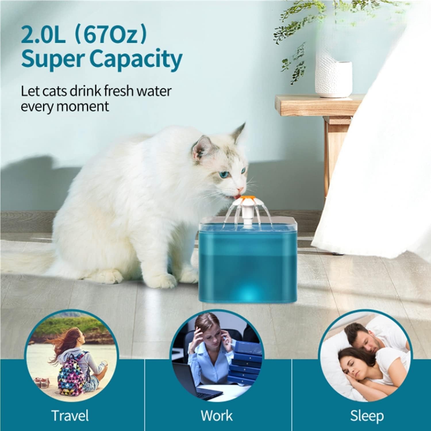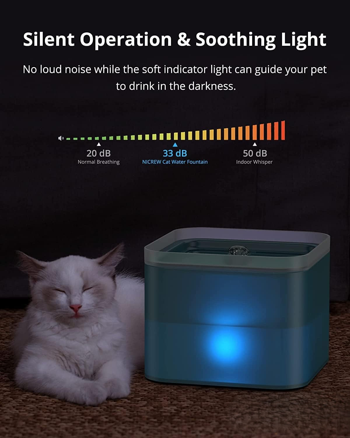 - With the super silent pump, you can hardly hear the sound of water, which does not affect you and your pet's rest. With 2W low power consumption, the pump can operate for a total of 10,000 hours and run dry for up to one week.